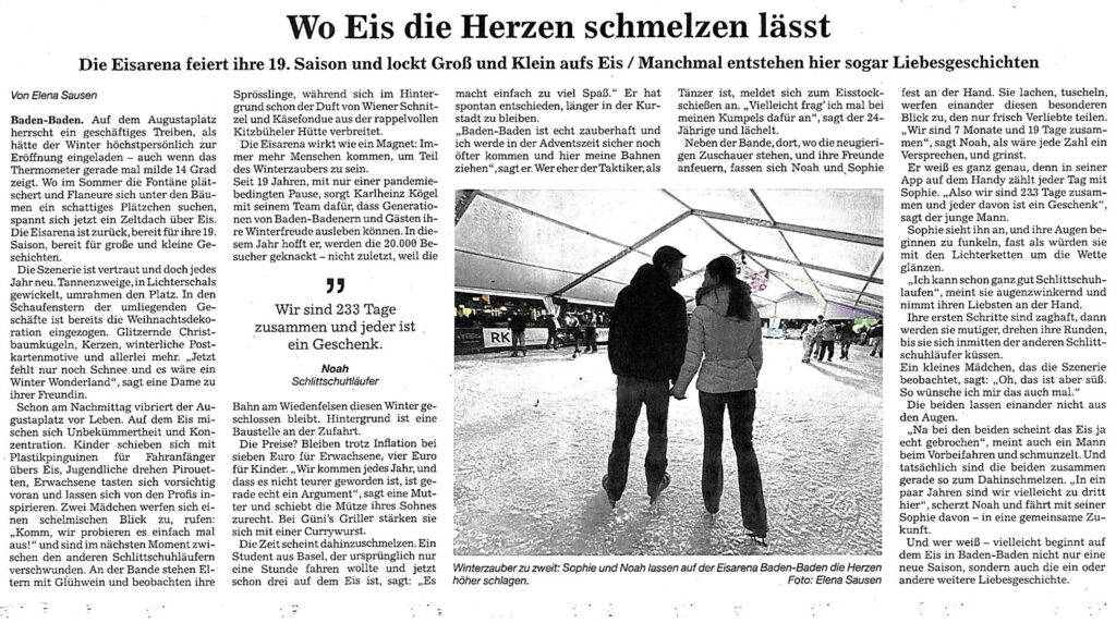 Am 14. November war es endlich soweit: Die Eisarena Baden-Baden öffnete ihre Pforten mit einer grandiosen Feier! Die beliebte TV-Moderatorin Evelin König und Karlheinz Kögel begrüßten die Besucher zu diesem besonderen Event. Das Highlight des Abends: Eine atemberaubende Show des Europa-Parks, die mit artistischen Glanzleistungen beeindruckte. Sportbegeisterte kamen ebenfalls auf ihre Kosten, als die Jugendmannschaft des ESC Hügelsheim ihr Talent auf dem Eis zeigte. Der Eintritt und die Nutzung der Arena waren bis 22:00 Uhr kostenfrei – ein festlicher Auftakt, der alle Sinne verzauberte!